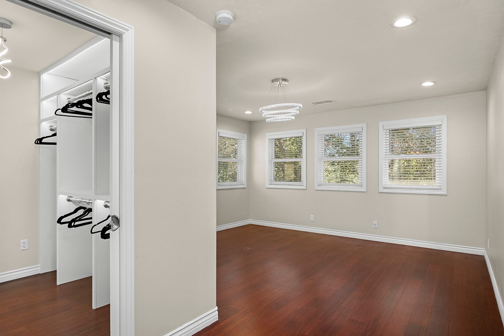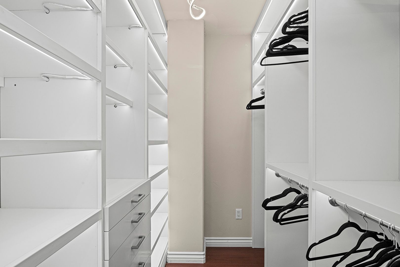 retreat, featuring a custom closet with built-in shelving and LED lighting, along with a spa-like