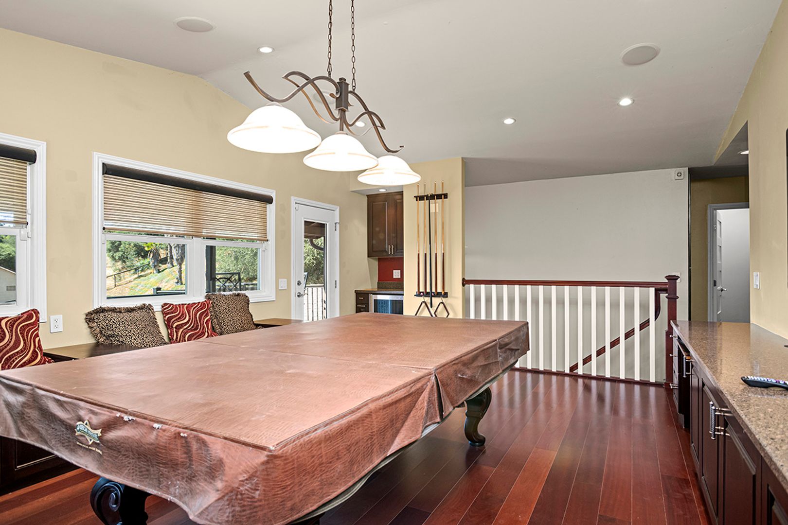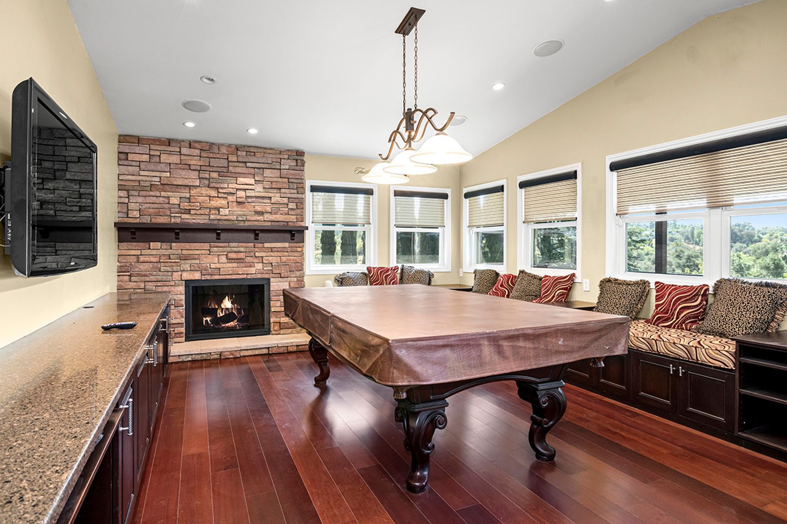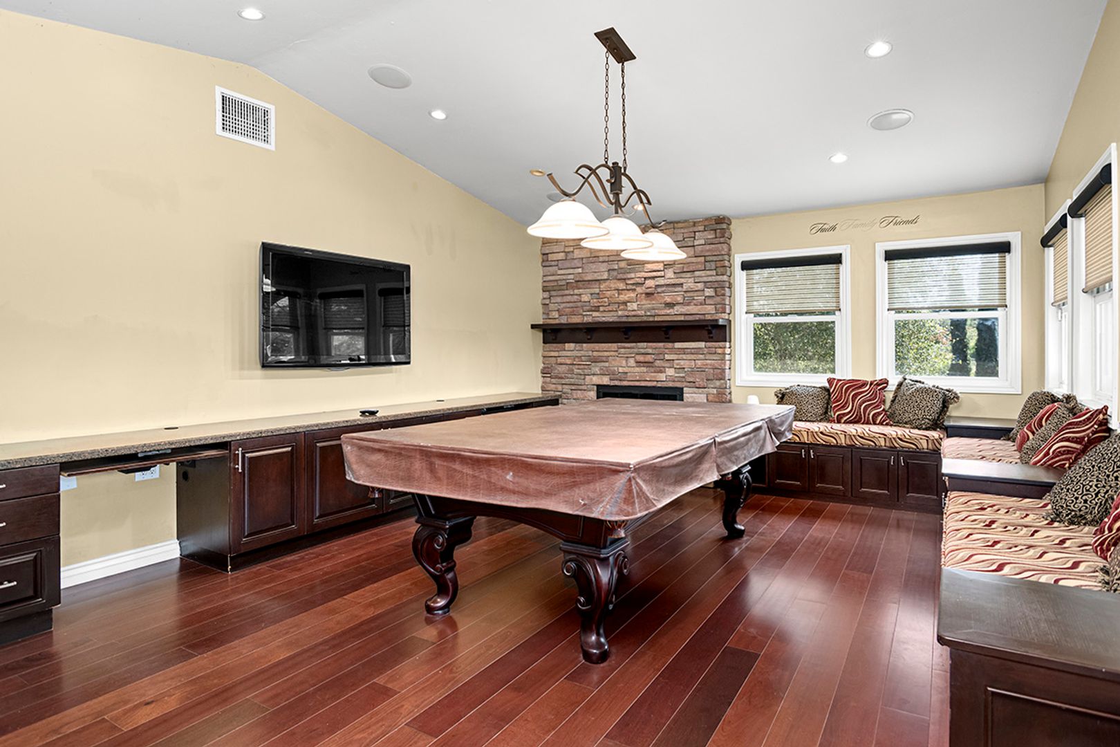 features a spacious and functional layout with a unique, custom-designed billiards room complete