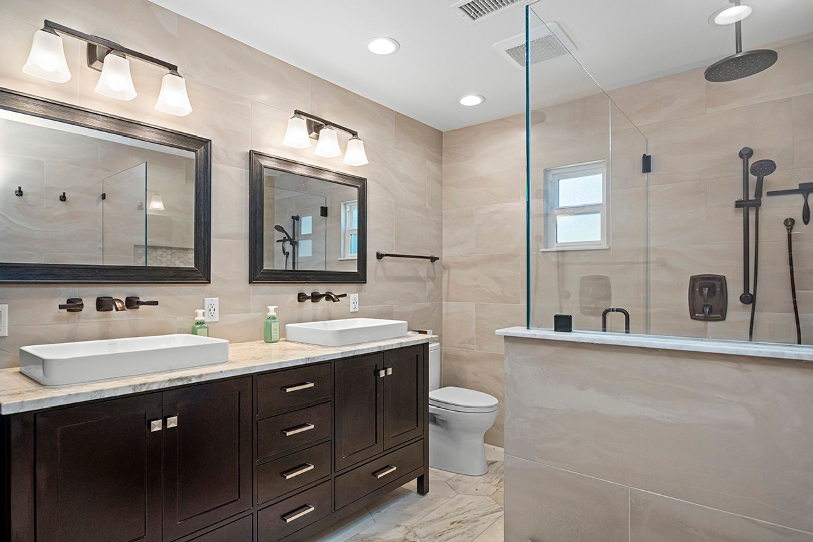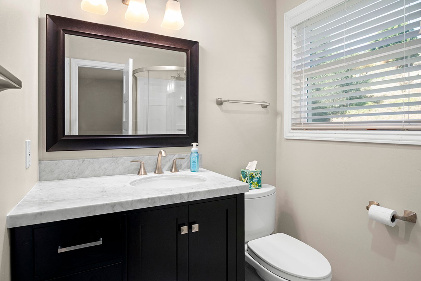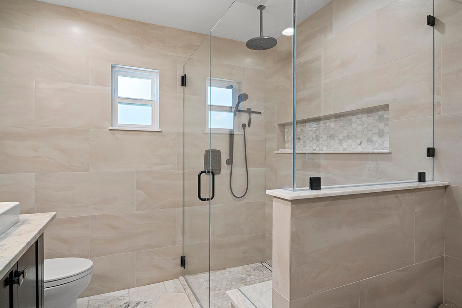 secondary bathrooms, and elegant marble flooring in the luxurious primary bathroom. The home