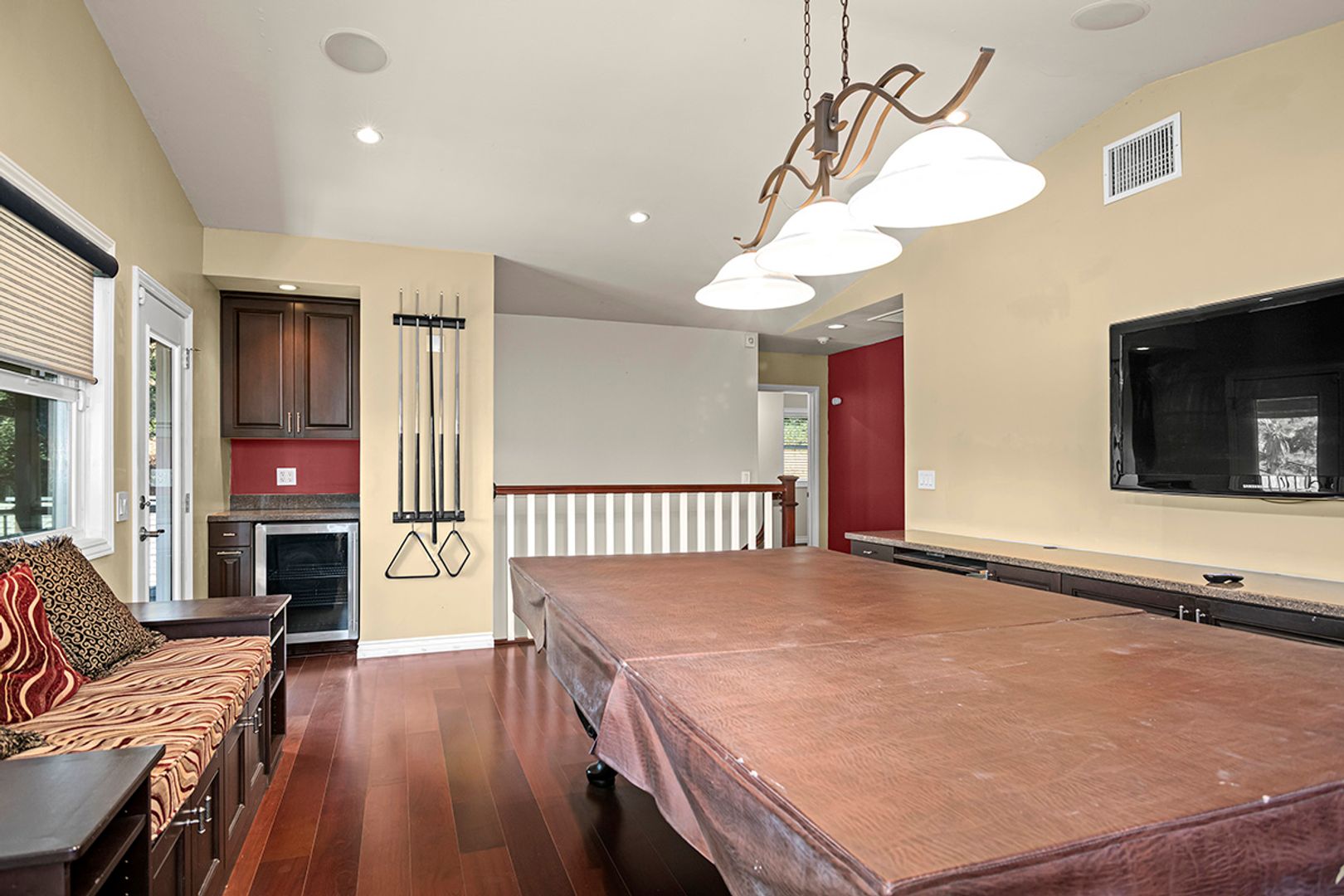 with a pool table, beverage refrigerator, and dual built-in workstations—perfect for entertaining,
